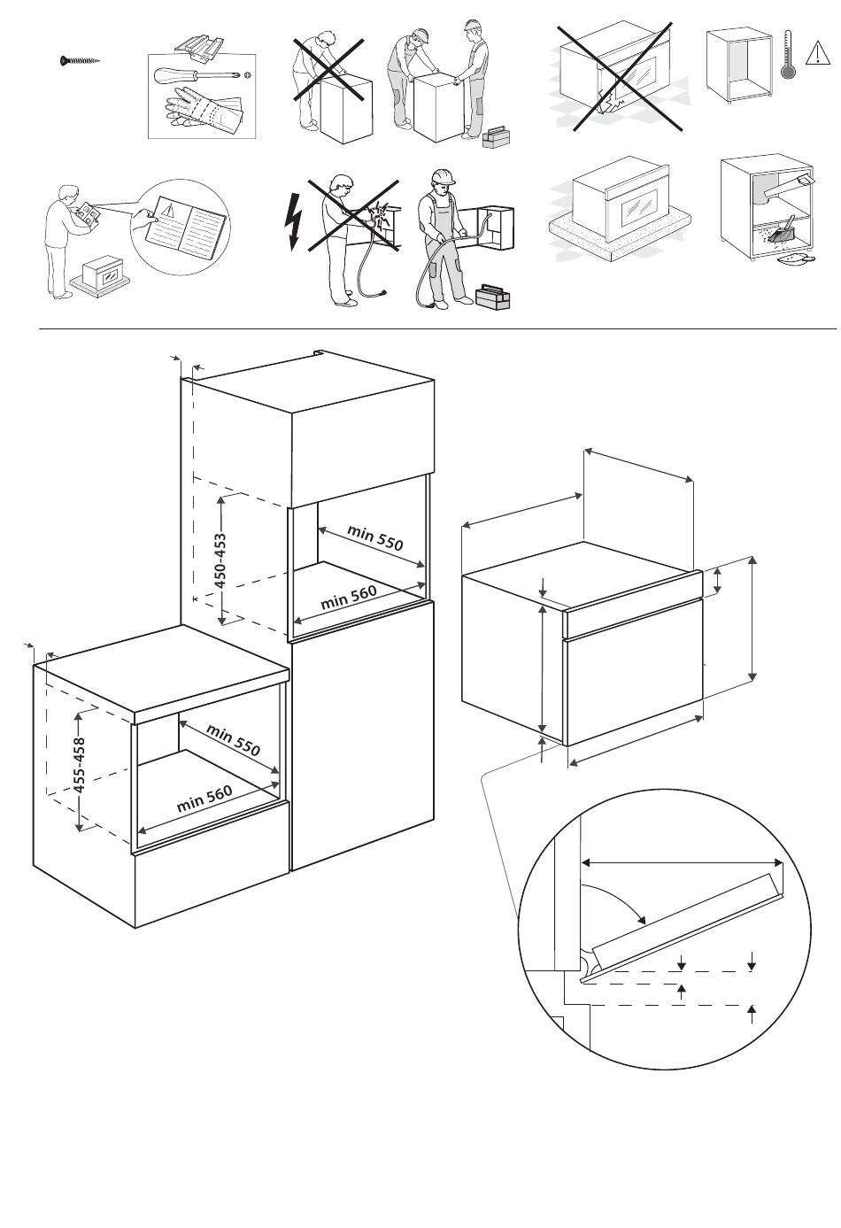 die Tür geschlossen, damit sich die Flammen nicht Stromschlaggefahr. Das Gerät erst starten, wenn ausbreiten können. die Installationsarbeiten abgeschlossen sind. Verwenden Sie das Mikrowellengerät nicht Den Unterbauschrank vor dem Einschieben des Geräts auf das Einbaumaß zurechtschneiden zum Frittieren, da die Temperatur des Frittieröls und alle Sägespäne und Schnittreste entfernen.
