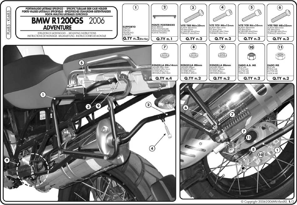 PORTAVAUGIE L *TERALE SPECIFICO • SPECIFIC T UBULAR SIDE-CASE H OLDER PORTE- VALISES LATERAUX SPÉCIFIQUE - SPEZIFISCHES STAHLROHR-SEITENTRAEGER PORTA MALETAS LATERALES ESPECiFlCO BMW R1200GS 2006 PONTE POSTERIORE VITE TCEI M6x15mm VITE TCEI M6x50mm VITE TBEI M6x50mm VITE TBEI M8x55mm ADVENTURE SUPPORTO REAR BRIDGE SCREW...