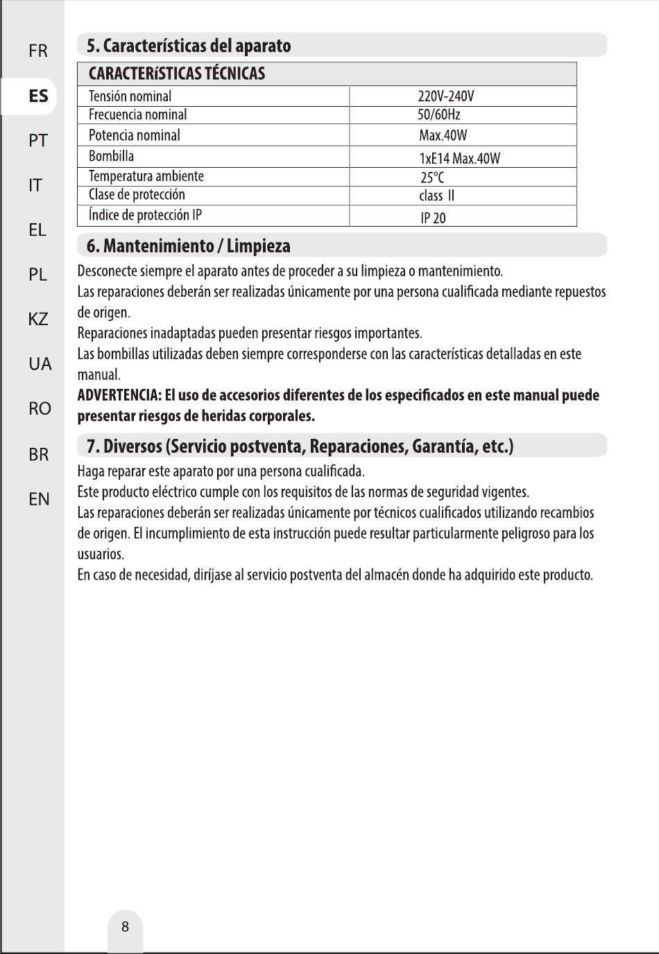 Lasbombillas utilizadas deben siempre corresponderse conlascaracteristicas detalladas e neste