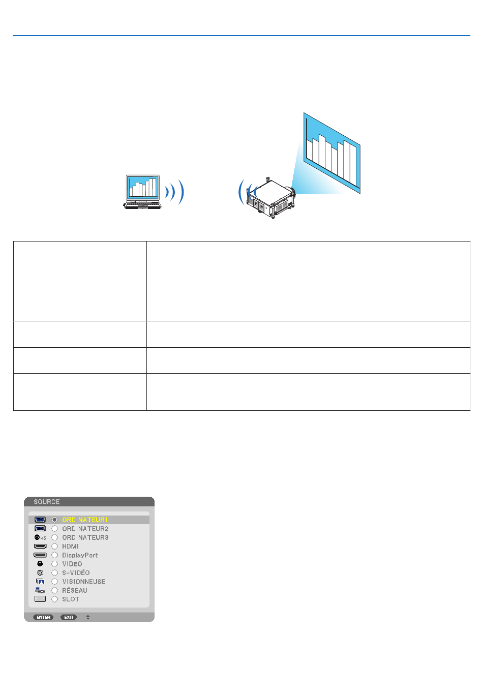 être projetée à l'écran via le réseau. Une connexion avec le câble de l'ordinateur (VGA) n'est pas nécessaire.