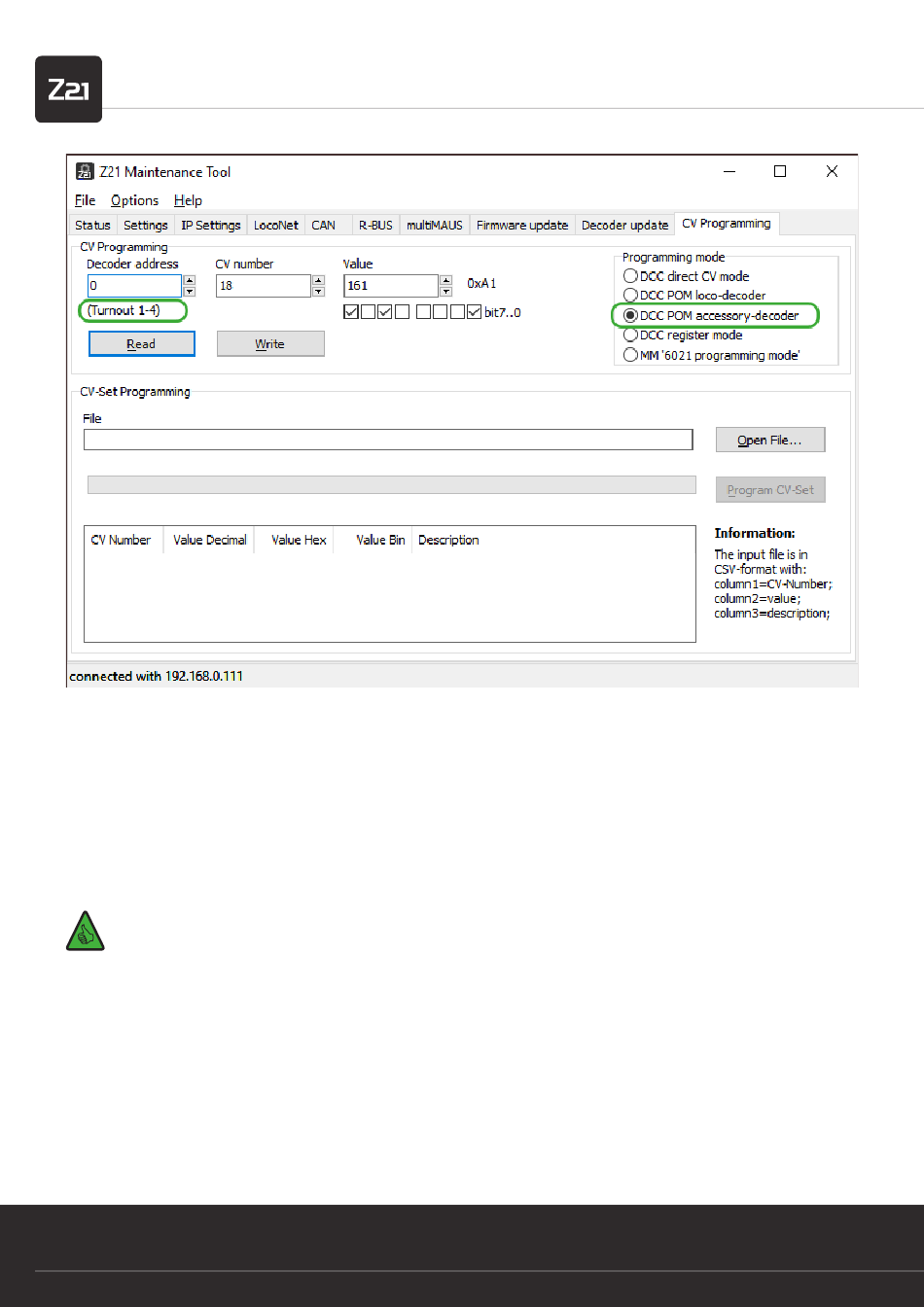It is essential to ensure here that the correct turnout address/decoder address has been selected before reading or writing so that the
