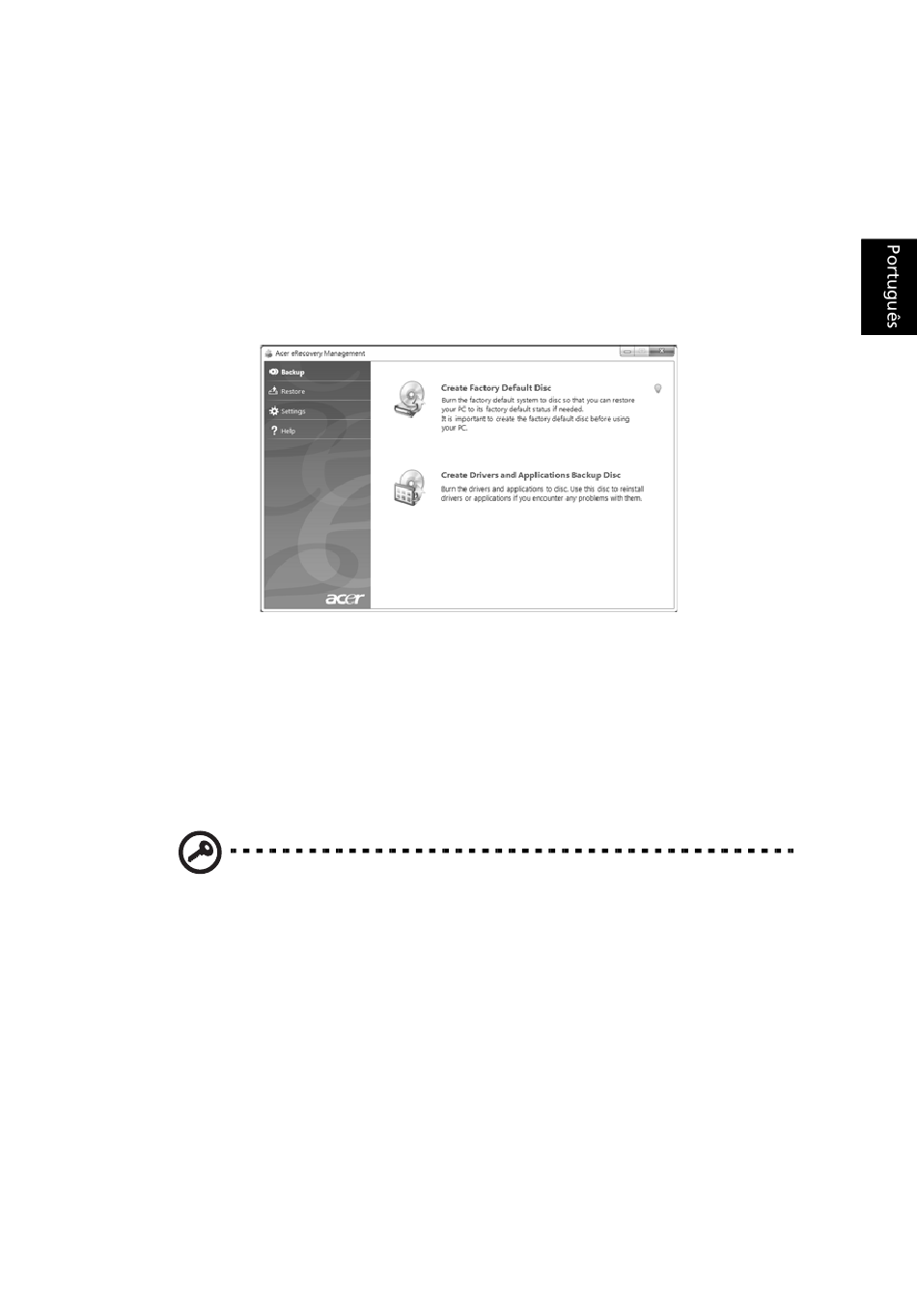 carregados em fábrica, clique em Criar disco com cópia de segurança de