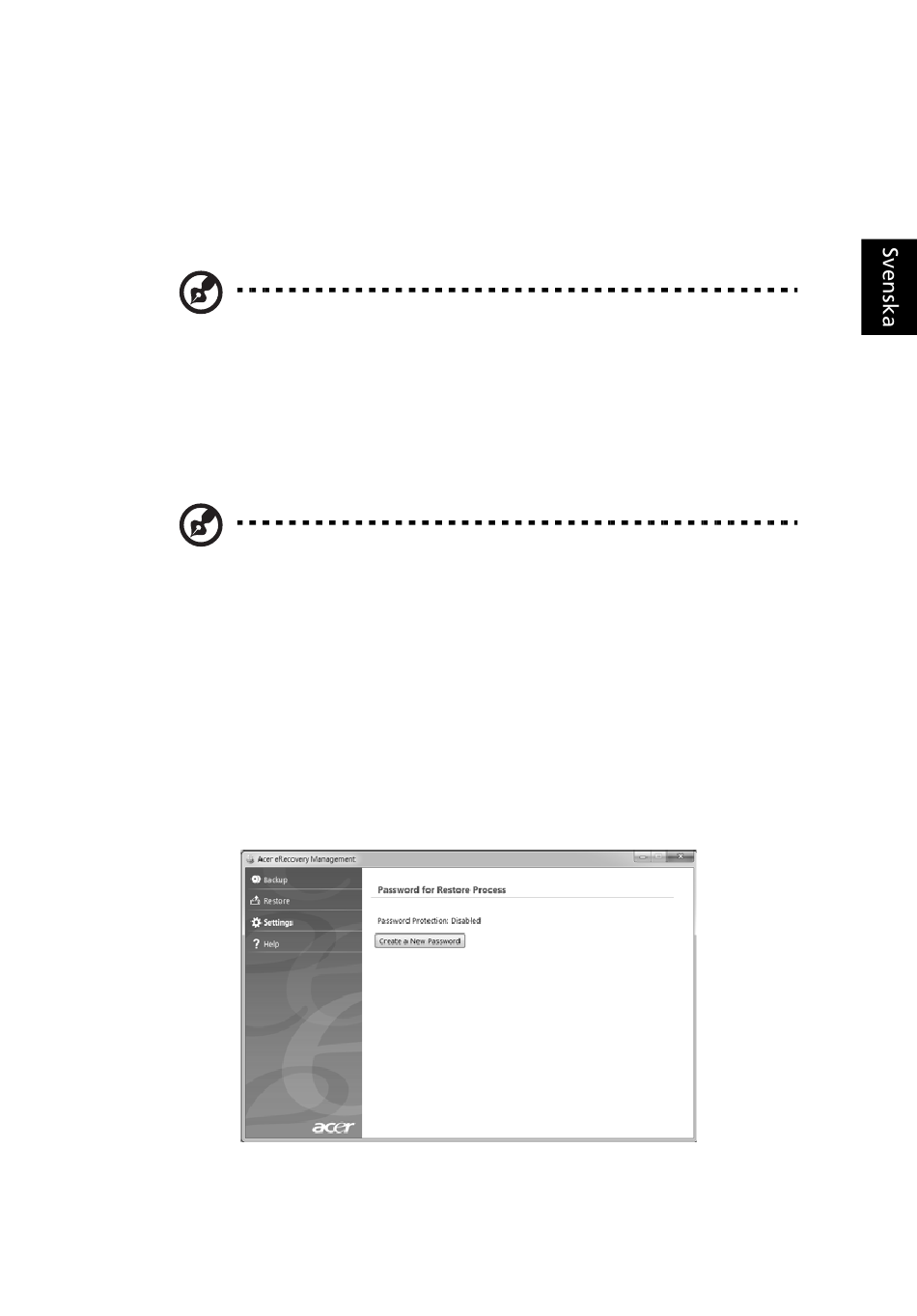 Acer eRecovery Management. Lösenordet anges genom att starta Acer