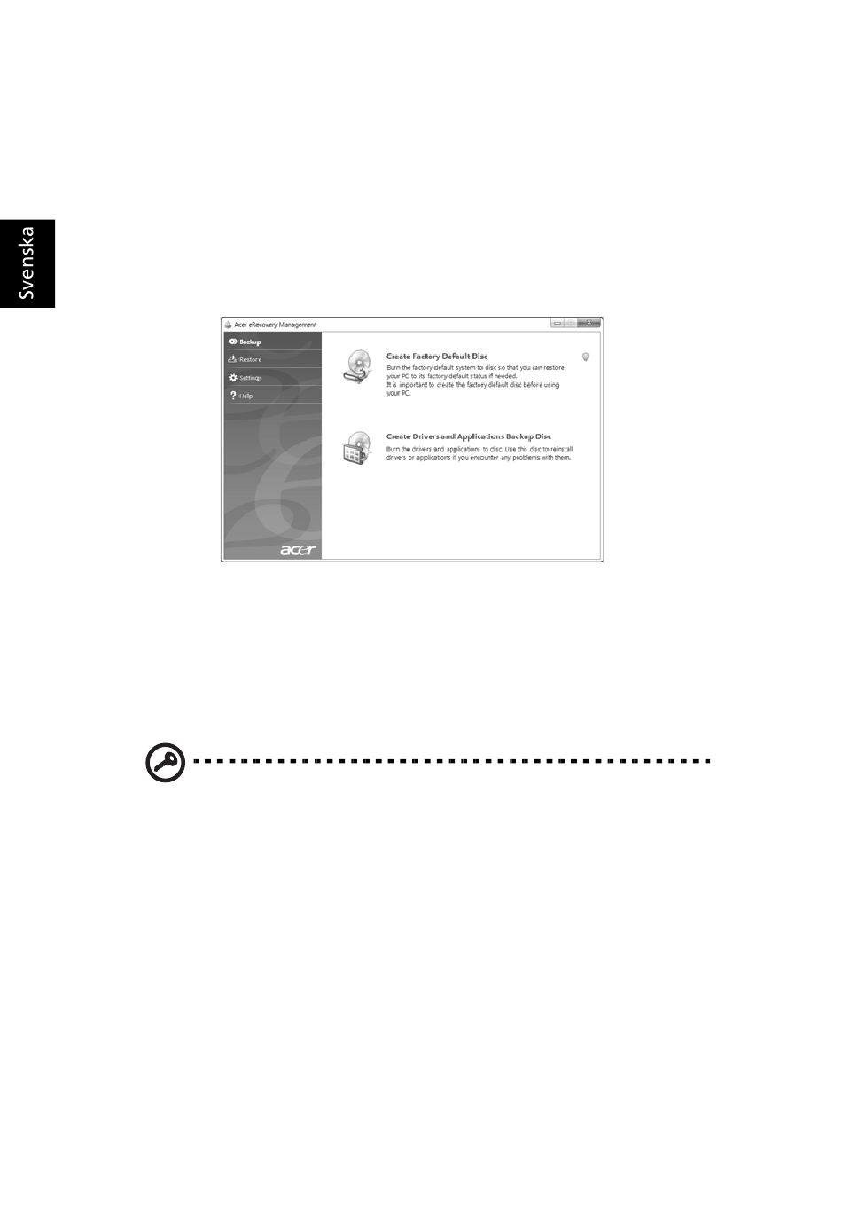 Klicka på Start > Alla program > Acer, och sedan på Acer eRecovery