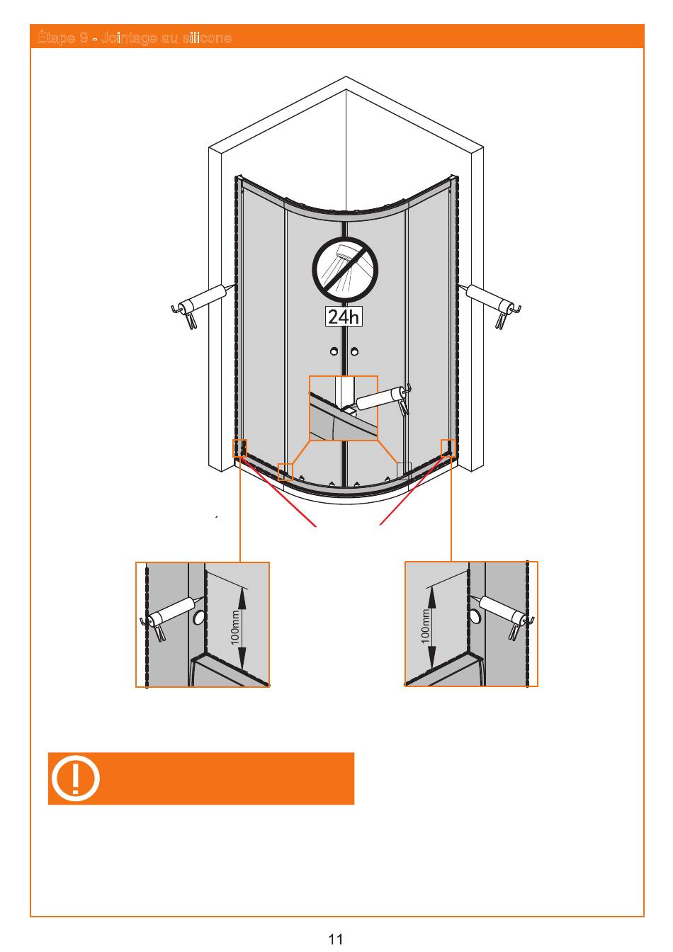 1.Appliquez le silicone uniquement sur l'extérieur des parois de douche.