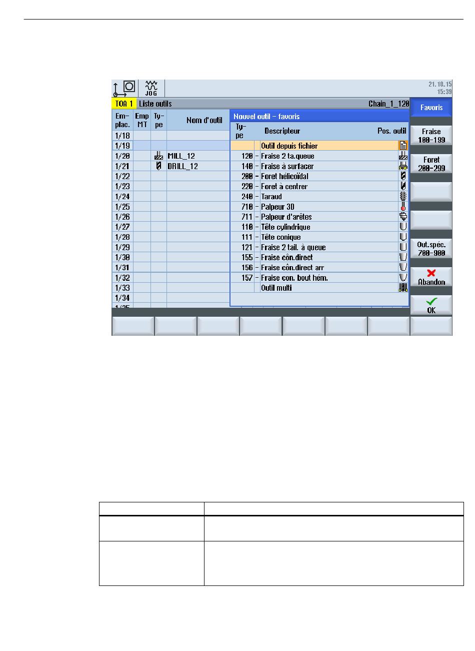 Lorsque la touche OK est actionnée, l'outil est créé dans la CN et initialisé avec les données du
